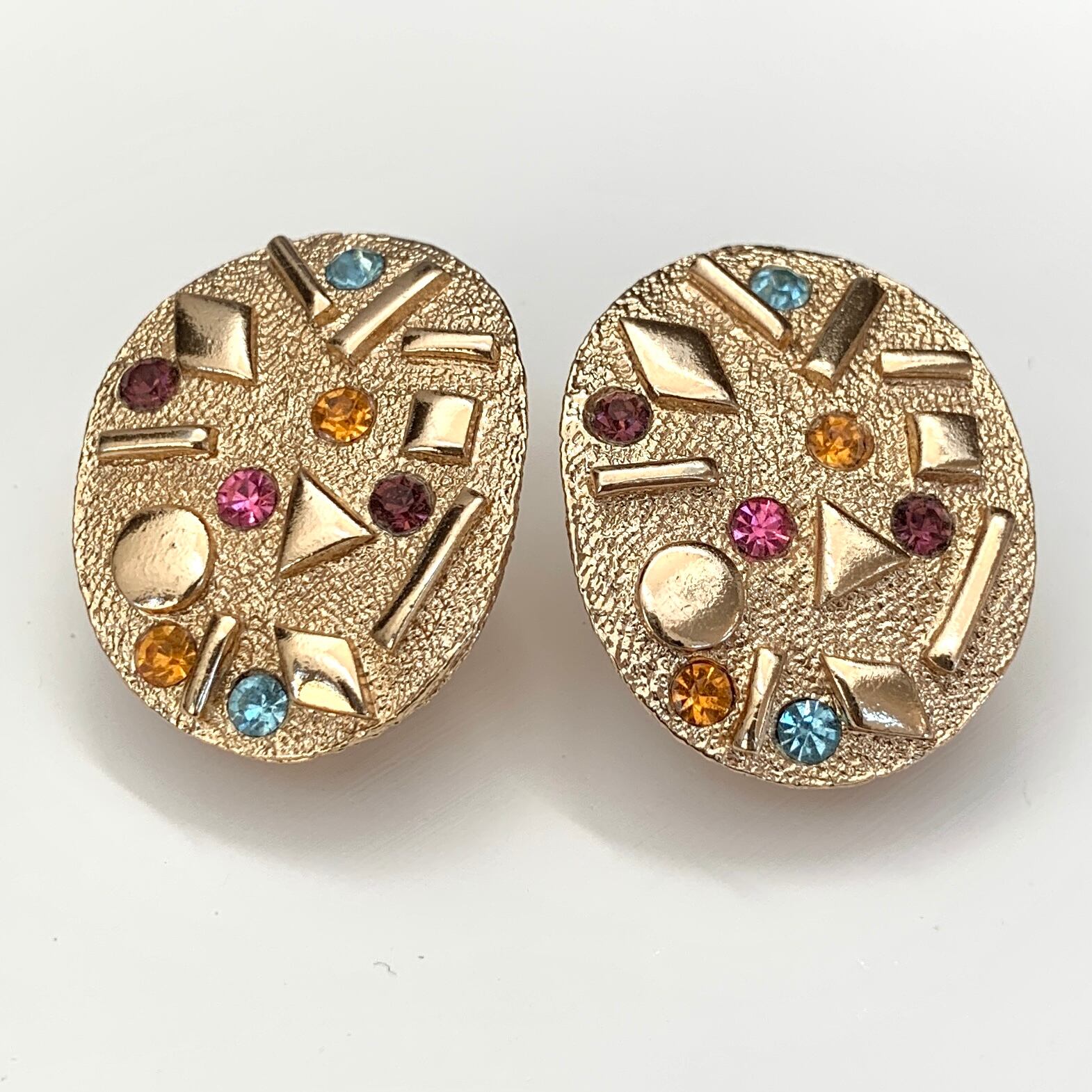質感のあるゴールドのラウンドに、光沢のあるゴールドの隆起と、色々な色のラインストーンが散りばめられたイヤリング『Sultana』