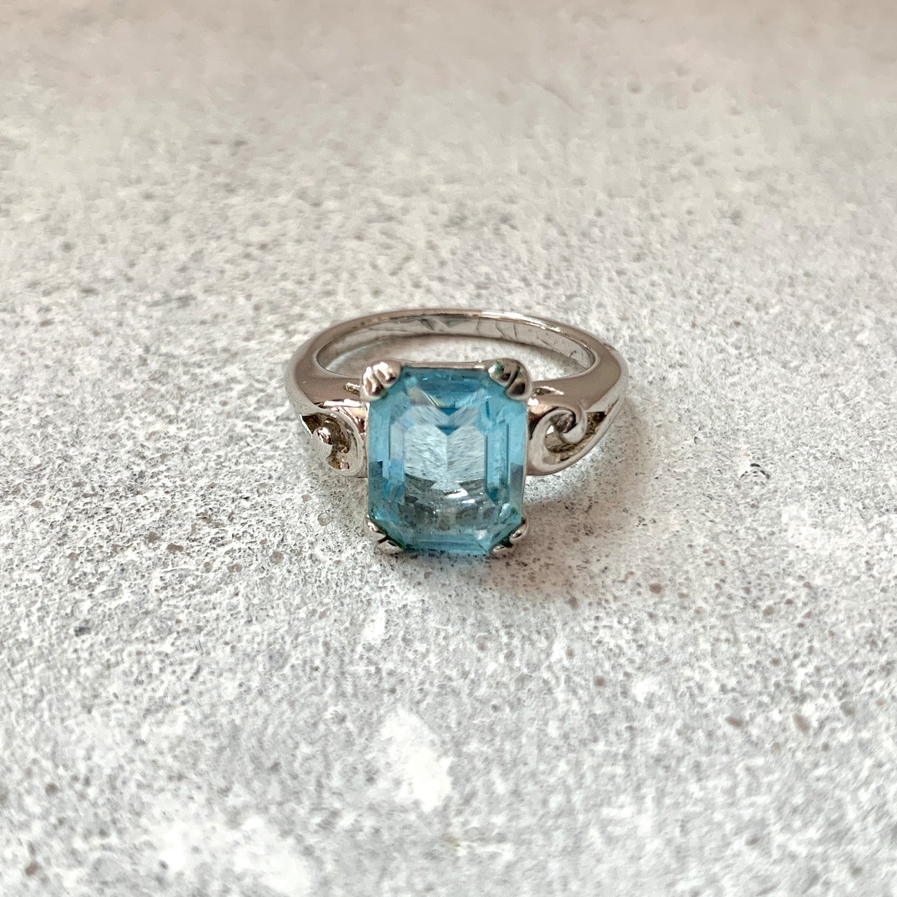 エメラルドカットされた、アクアマリンカラーの大きなラインストーンのリング。